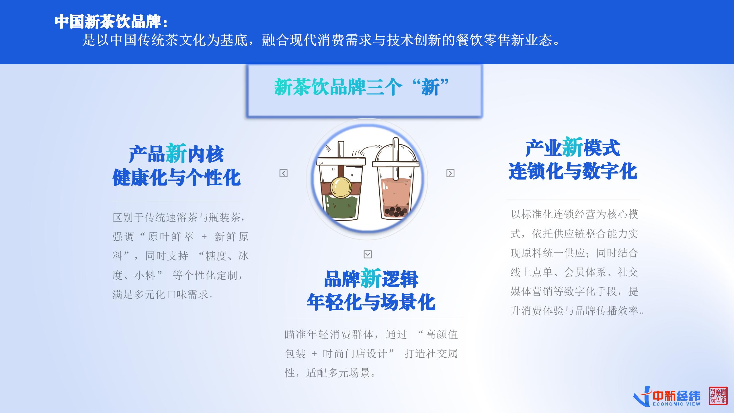根据《报告》,新茶饮品牌与传统茶饮品牌存在诸多不同。在产品内核方面,新茶饮品牌更强调健康化与个性化。其强调“原叶鲜萃+新鲜原料”,并支持个性化定制,满足多元化口味需求。在品牌逻辑方面,新茶饮品牌更注重年轻化与场景化。通过“高颜值包装+时尚门店设计”打造社交属性,适配多元场景。在产业模式方面,新茶饮品牌更加注重连锁化与数字化经营。以标准化连锁经营为核心模式,依托供应链整合能力实现原料统一供应;同时结合线上点单、会员体系、社交媒体营销等数字化手段,提升消费体验与品牌传播效率。