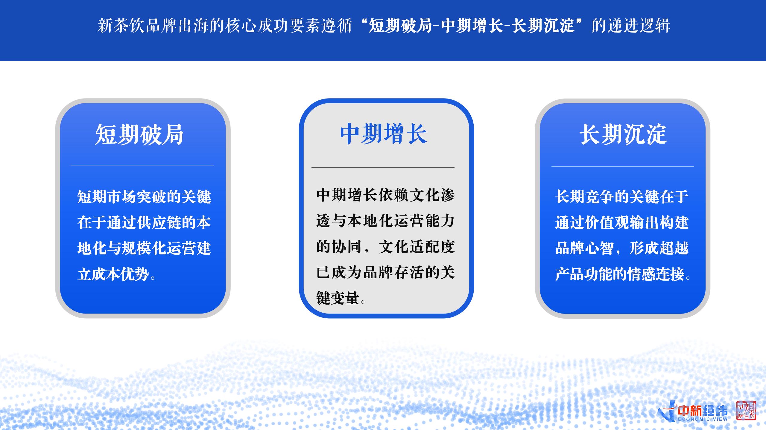 《报告》认为,新茶饮品牌出海的核心成功要素是遵循了“短期破局-中期增长-长期沉淀”的递进逻辑。短期市场突破的关键在于通过供应链的本地化与规模化运营建立成本优势。中期增长依赖文化渗透与本地化运营能力的协同,文化适配度已成为品牌存活的关键变量。长期竞争的关键则在于通过价值观输出构建品牌心智,形成超越产品功能的情感连接。