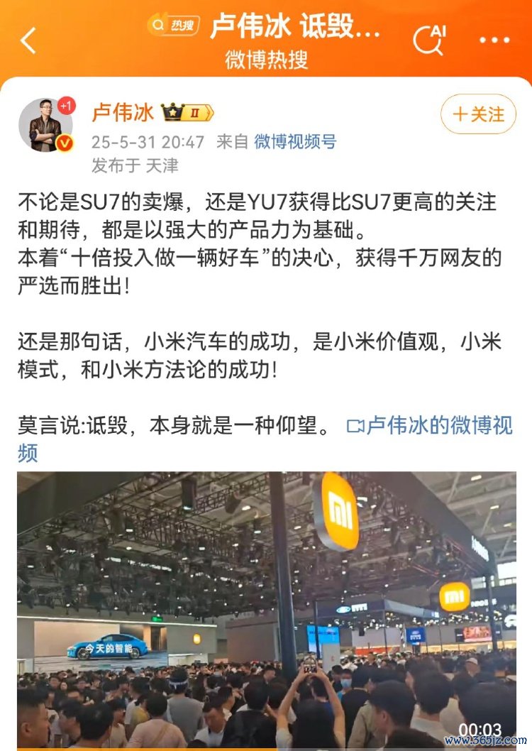 5月31日晚间,小米总裁@卢伟冰疑似隔空回怼余承东:不论是SU7的卖爆,还是YU7获得比SU7更高的关注和期待,都是以强大的产品力为基础。本着“十倍投入做一辆好车”的决心,获得千万网友的严选而胜出! 还是那句话,小米汽车的成功,是小米价值观,小米模式,和小米方法论的成功! 莫言说,诋毁,本身就是一种仰望。